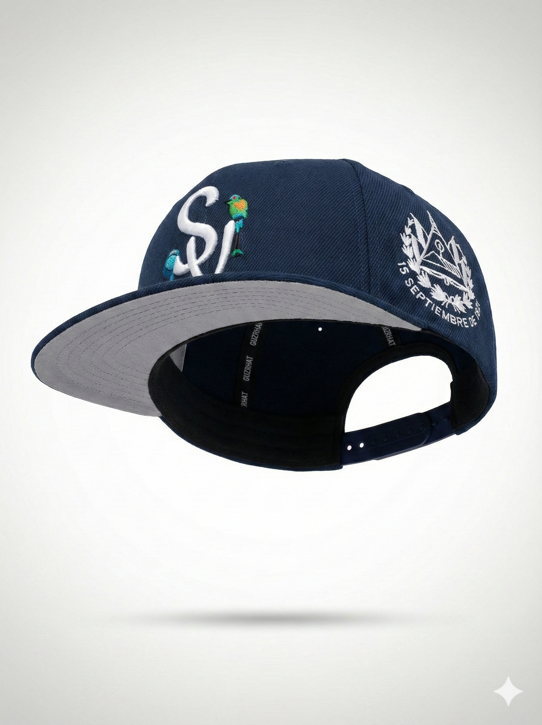 "Esta gorra de El Salvador cuenta con un diseño único, con el ave nacional torogoz, el escudo bordado en 2d en color blanco y el color de la gorra azul marino. Con su forma recta, es perfecta para mostrar tu apoyo y orgullo por tu país."